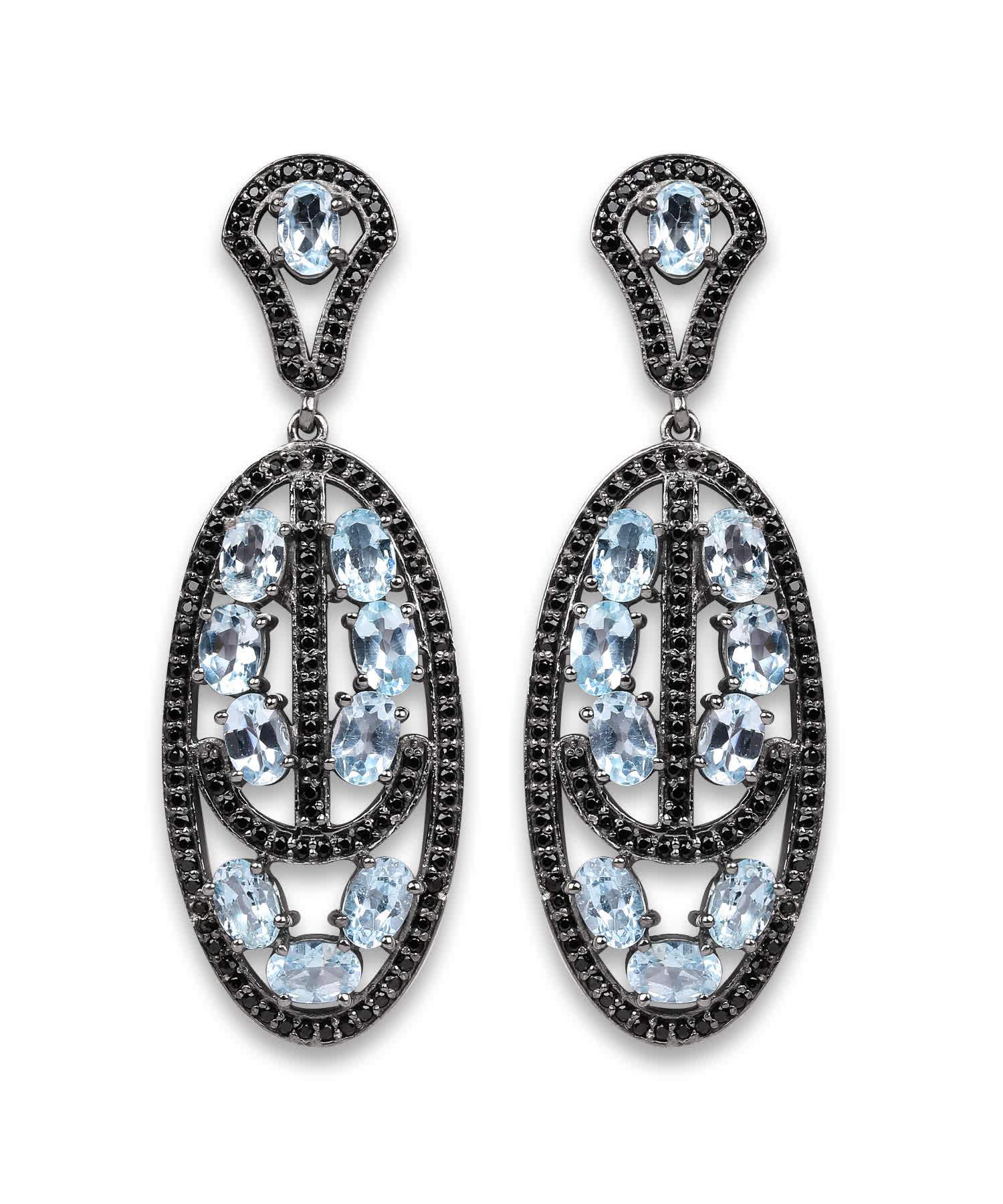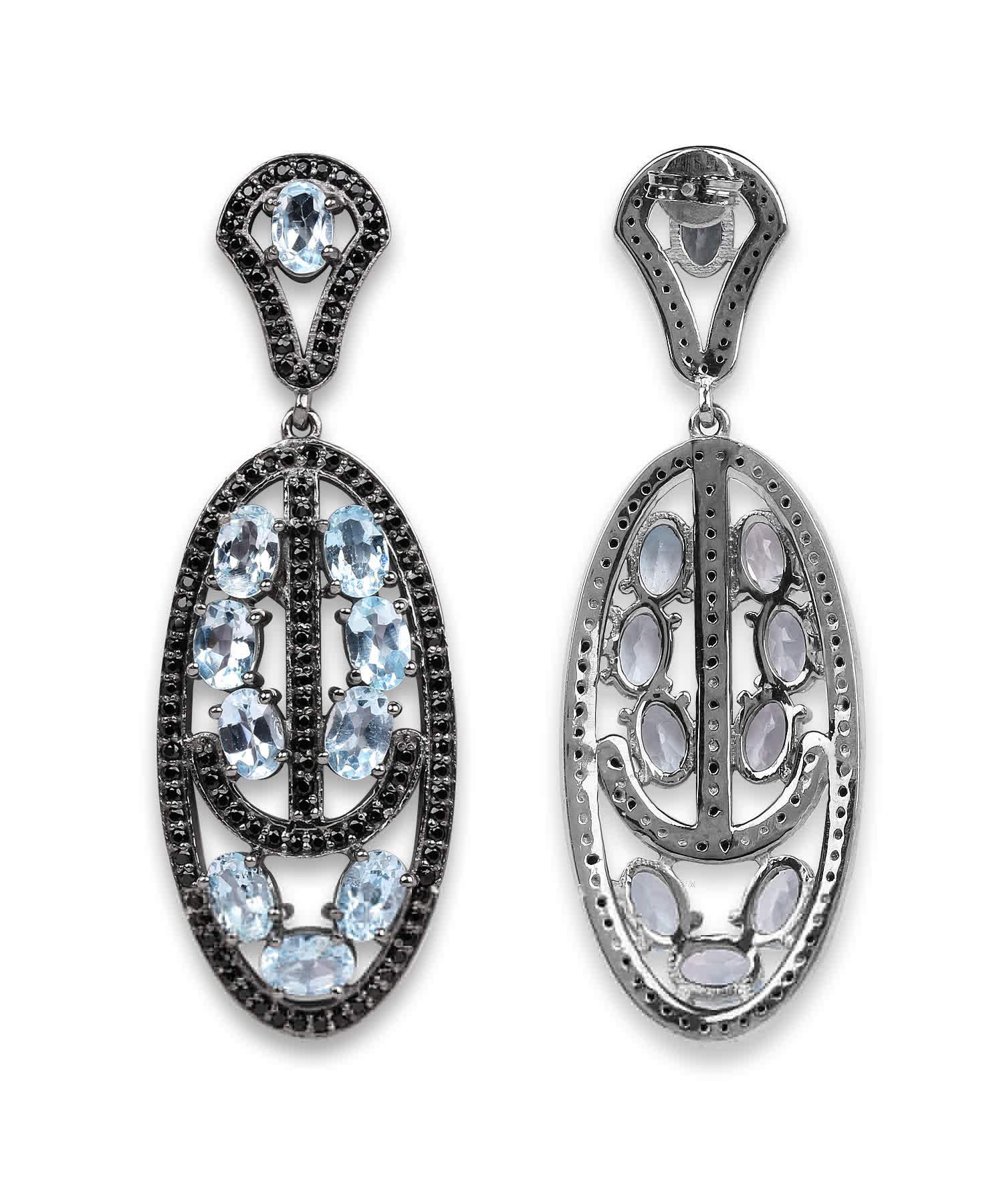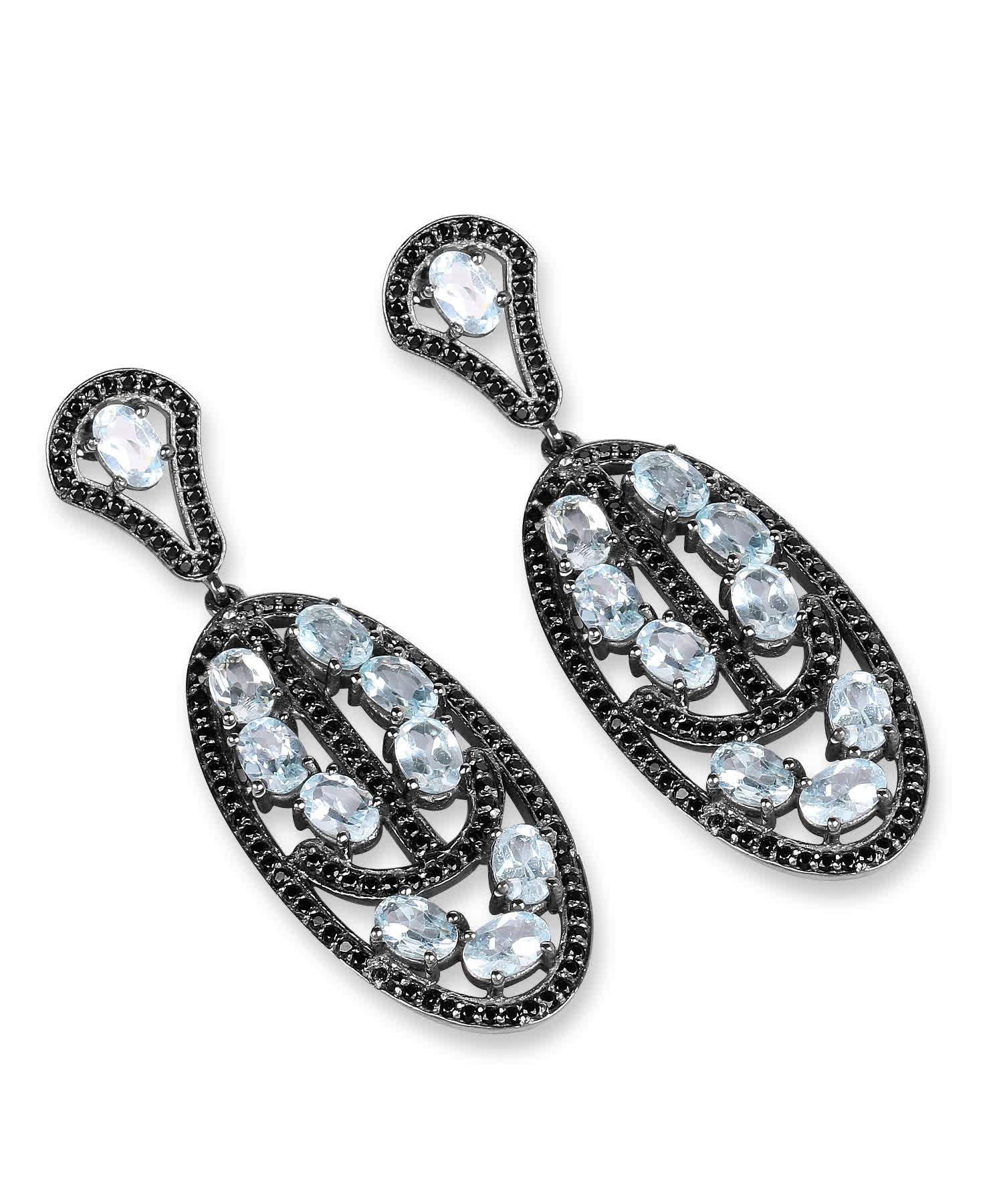 13.80 ctw Natural Sky Blue Topaz and Black Spinel Rhodium Over 925 Sterling Silver Antique Style Dangle Earrings
